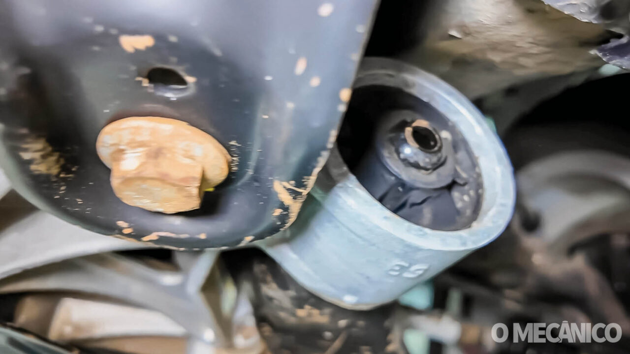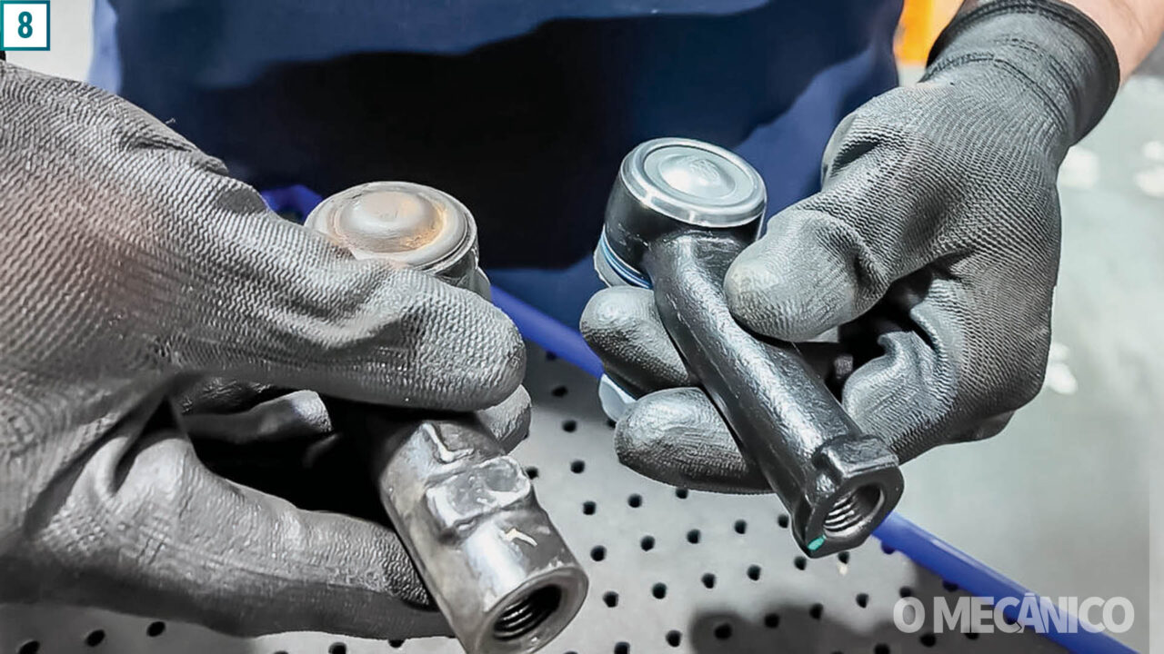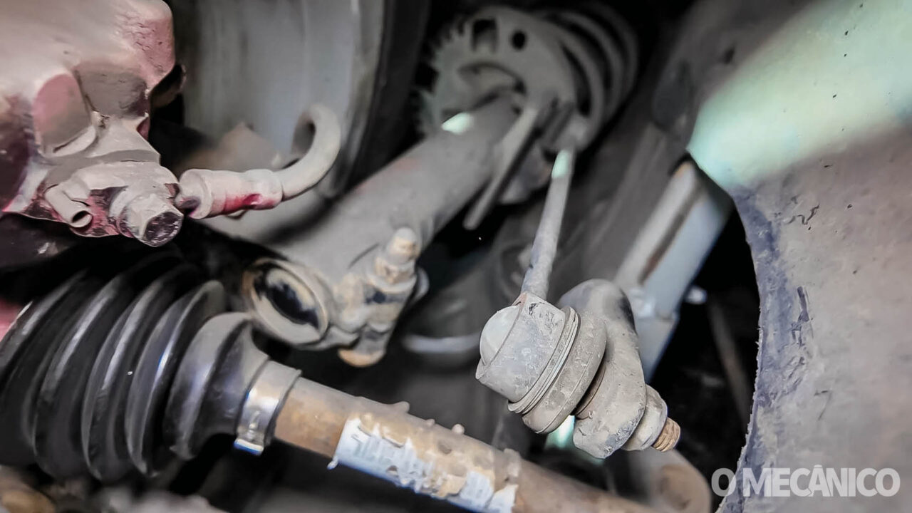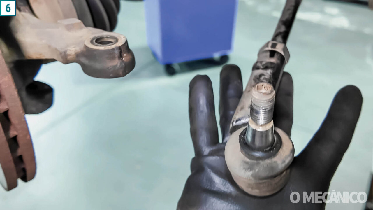 6) O uso de um extrator é indispensável para desencaixar o terminal sem danificar o montante. Porém, neste caso, o pino esférico saiu com pouca interferência, assim, demonstrando que o componente já não apresentava boas condições de uso.