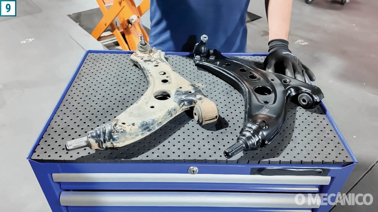 9) Verifique as bandejas de suspensão. No caso da bandeja aplicada pela Nakata, o componente já vem com o novo pivô de suspensão instalado.
