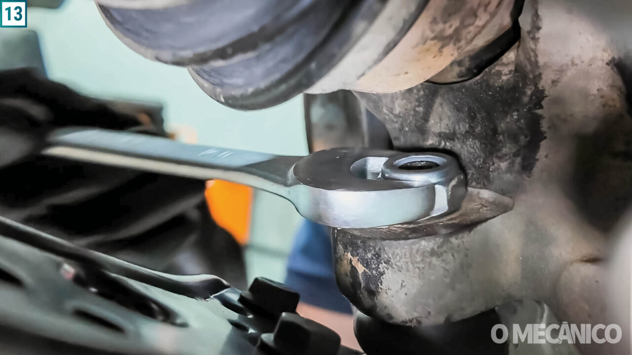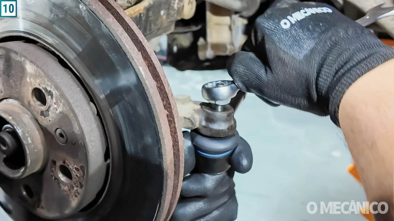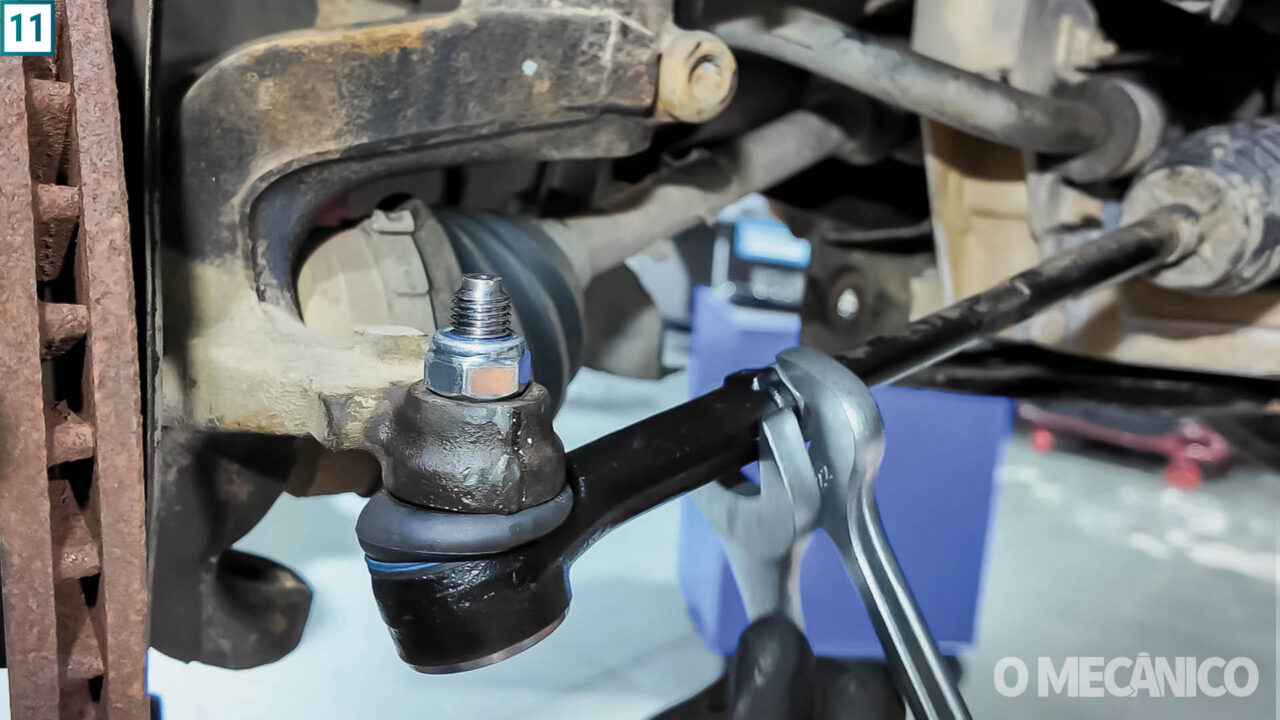 10) A montagem deve seguir a ordem inversa da desmontagem, com atenção rigorosa aos detalhes. Instale o novo terminal de direção e aperte a porca que prende o pino esférico a manga de eixo.
