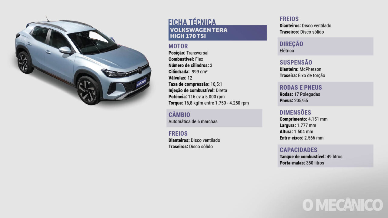 Já o Tera High traz também um pacote tecnológico vasto com botão de partida, assistências como ACC, frenagem autônoma de emergência (AEB), sistema Volkswagen Play Connect com tela de 10,1 polegadas e conectividade sem fio aos sistemas Android Auto e Apple Car Play, painel digital e rodas de liga diamantadas que adicionam sofisticação externa.
