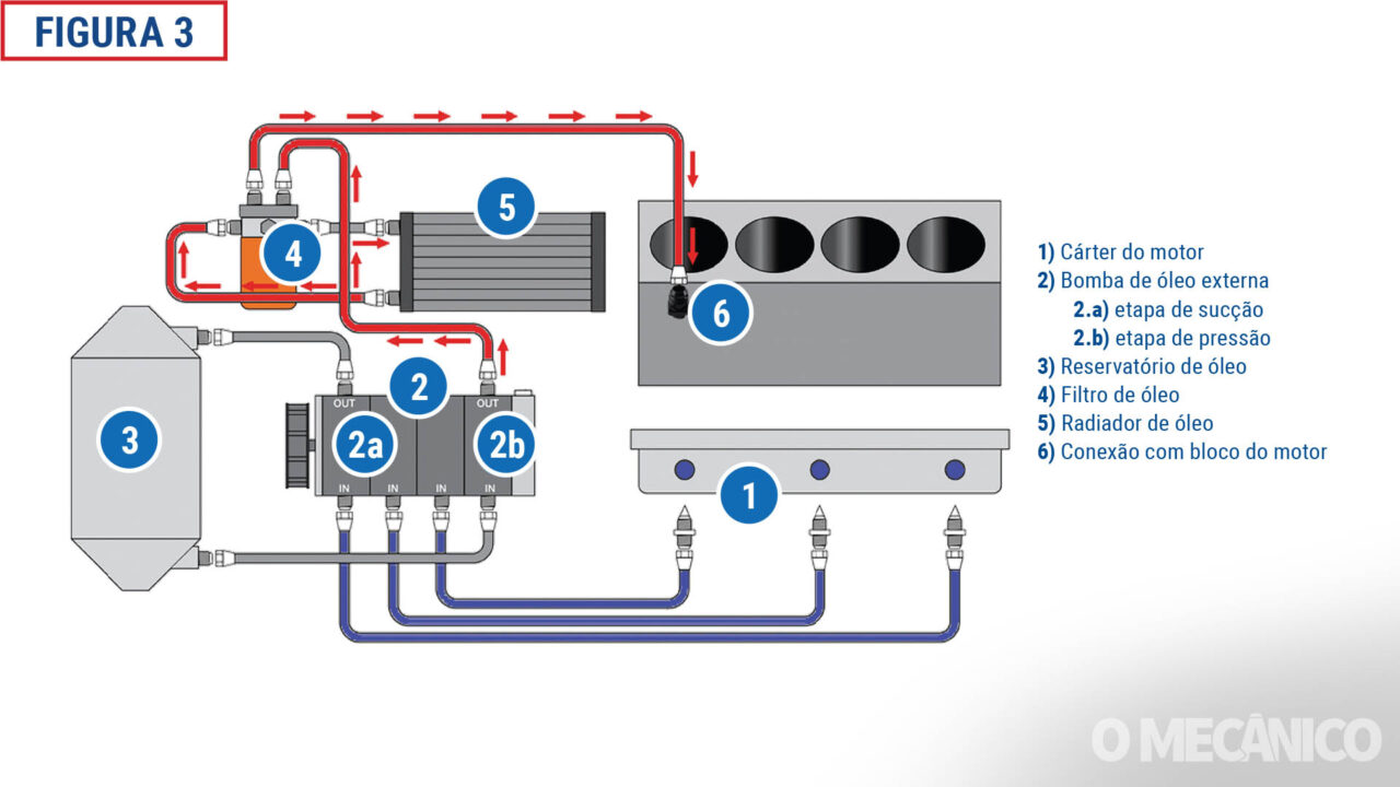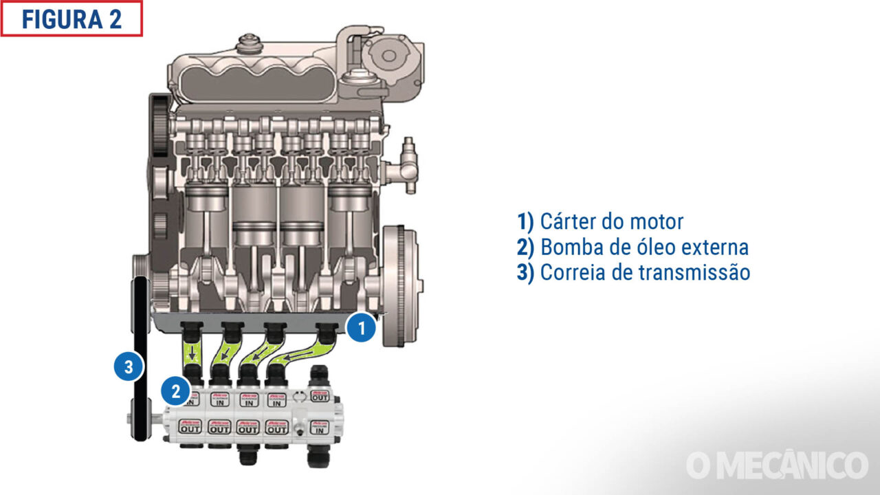 Esse óleo contido no cárter de menores dimensões, passará a ser aspirado por uma bomba de óleo externa (2), e depois acumulado em um depósito externo de óleo, geralmente de maior capacidade de fluido lubrificante se comparado com os sistemas convencionais.