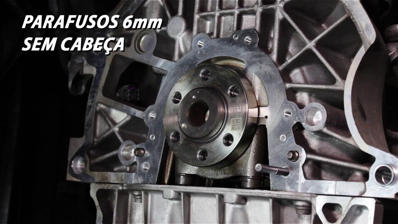 7 – Coloque o retentor nos parafusos guias e empurre com as mãos contra a face do bloco. A roda fônica e a luva plástica protetora irão se soltar. Descarte a luva. Retire os guias, coloque os parafusos sextavados e fixe a flange do retentor.