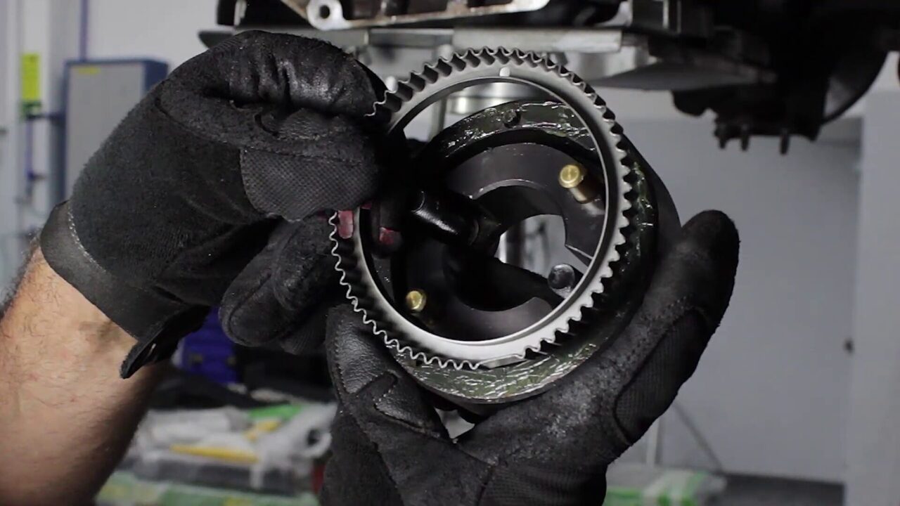 1 – Desligue a bateria, escoe o óleo do câmbio e solte as mangas de eixo. Incline o motor, remova a caixa de câmbio e o volante da embreagem.