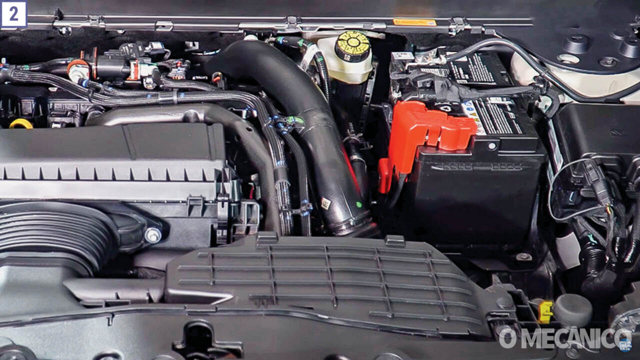 Ao abrir o capô, o primeiro ponto que chama atenção na Maverick Tremor é a organização (1). A picape utiliza o motor 2.0 EcoBoost, já conhecido na linha Ford, mas com uma configuração atualizada. O conjunto, apesar de tecnológico, foi projetado de modo a facilitar o acesso a diversos componentes. Cleyton destaca que “é um EcoBoost, mas bem melhorado. A construção do conjunto é muito bacana e surpreende pela simplicidade de acesso”.