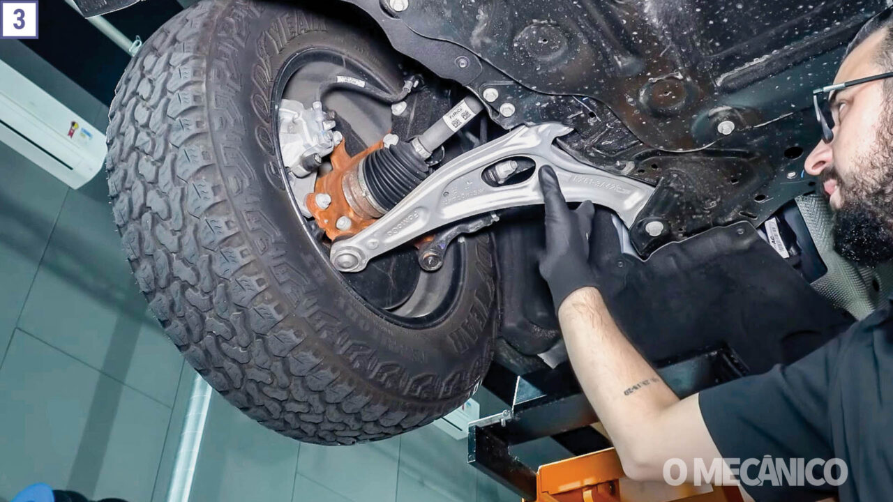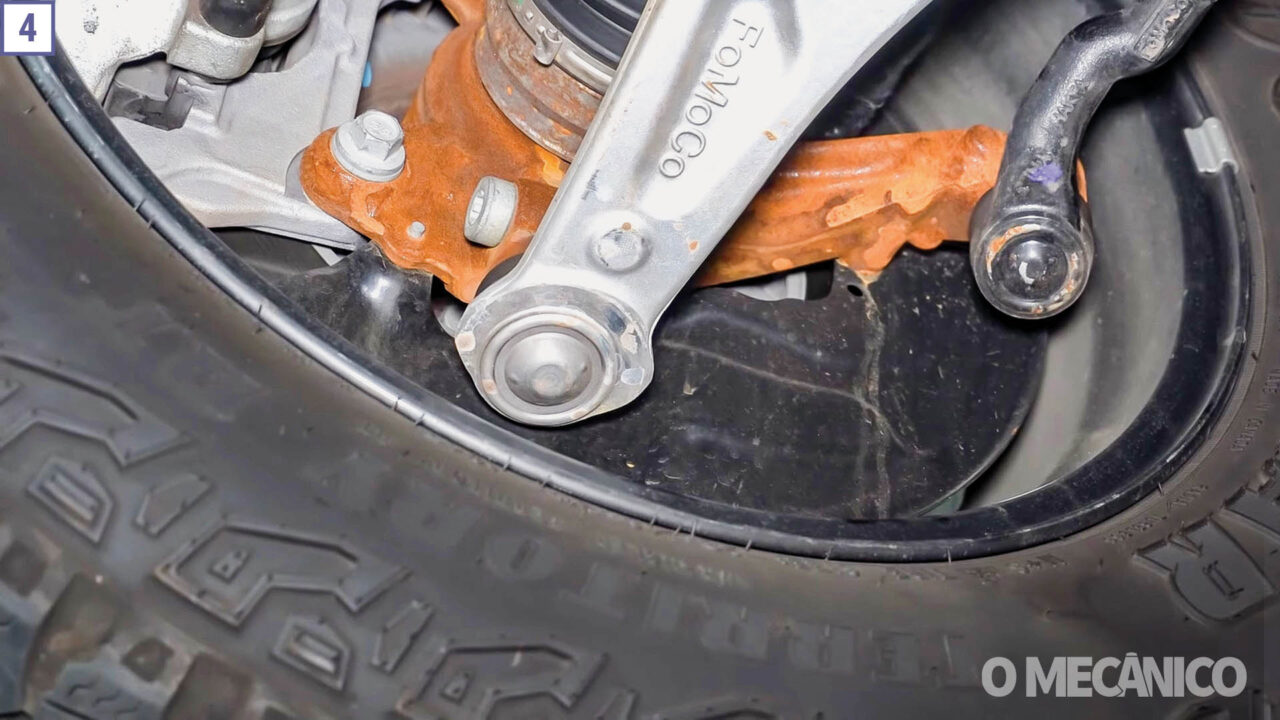 A suspensão dianteira da Maverick Tremor utiliza o sistema McPherson, mas com elementos reforçados para o uso em off-road. A bandeja é fabricada em liga de alumínio (3), o que reduz o peso e aumenta a resistência. Porém, o pivô não é substituível individualmente (4), se houver folga, é necessário trocar toda a bandeja. “A suspensão é robusta, mas não foge ao que estamos acostumados. O ponto crítico é o pivô, pois, abriu folga, troca o conjunto todo”, pontua Cleyton. Além disso, os amortecedores são exclusivos da versão Tremor, com curso maior e calibragem específica para trilhas, o que também contribui para que a picape seja mais alta que a versão Black em mais de 20 mm.