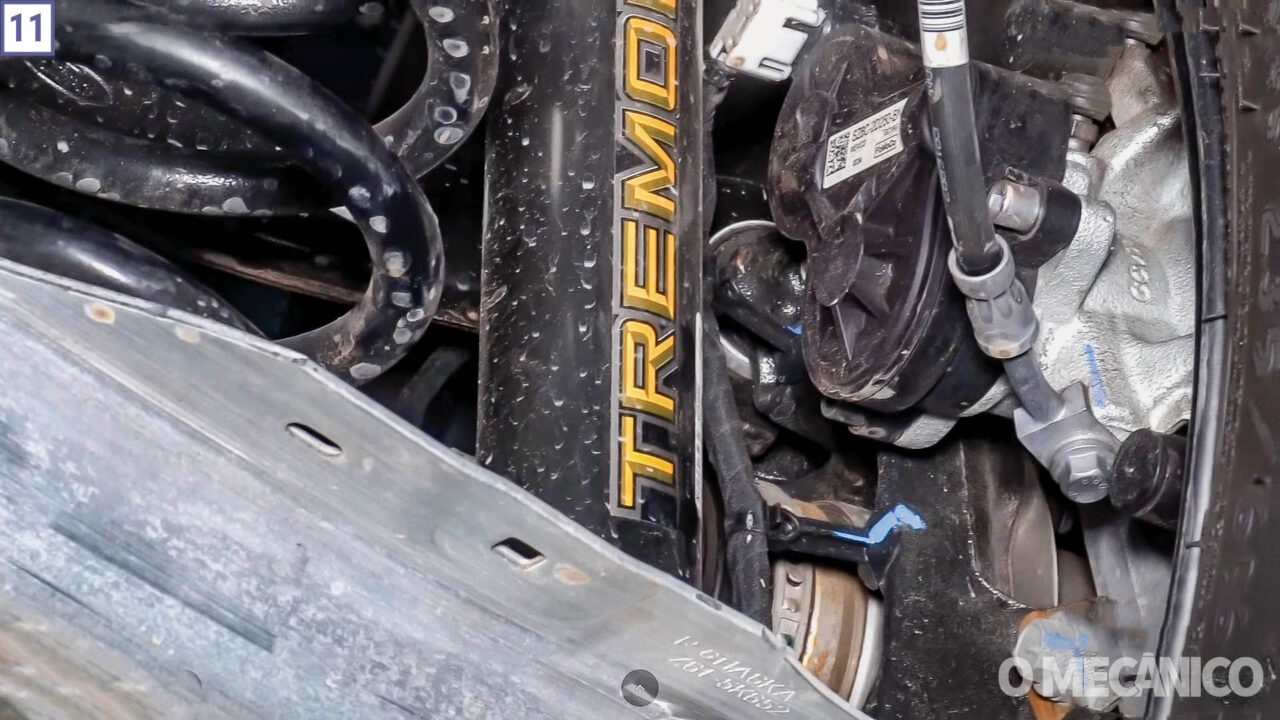 A parte traseira utiliza um sistema de suspensão independente (8), com múltiplos braços e amortecedores exclusivos da linha Tremor (9). Apesar da complexidade da arquitetura, o acesso aos amortecedores é bastante simples, já que o coxim superior pode ser alcançado pela lateral da roda (10). “Os amortecedores traseiros são fáceis de substituir. Já os braços da suspensão têm uma construção mais complexa, mas nada fora do padrão”, informa o mecânico.
