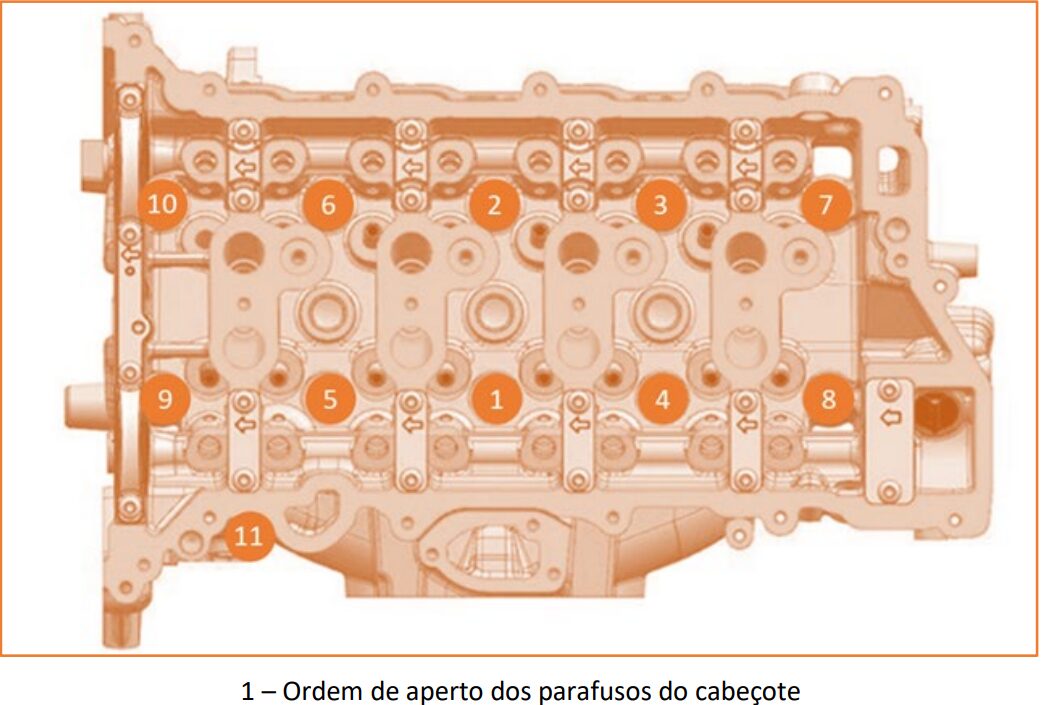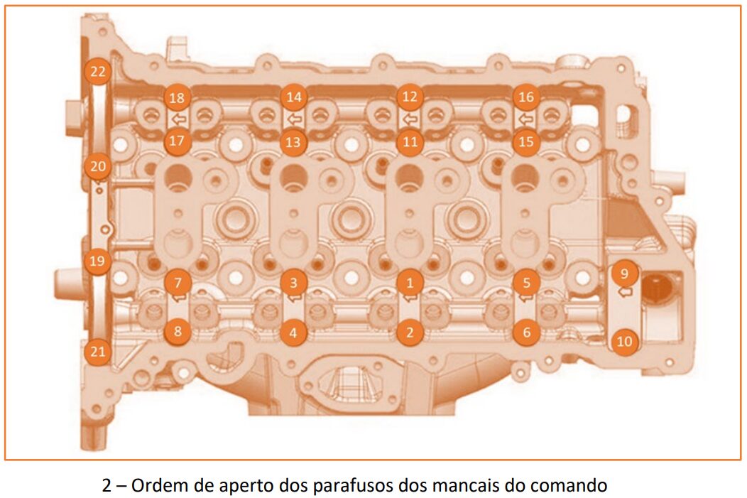Lembrando, respeitar os torques de aperto especificados pelo fabricante não é apenas uma formalidade técnica, mas condição fundamental para garantir vedação correta, integridade estrutural e durabilidade dos componentes. No cabeçote, por exemplo, os parafusos M11 seguem sequência em cinco etapas, começando com 20 Nm, passando por duas fases de 55 Nm, seguidas de aperto angular de 180° e finalização com parafusos M8 a 28 Nm. Já os mancais do comando de válvulas e a tampa de válvulas trabalham com torque de 10 Nm, enquanto os atuadores fixados à tampa exigem apenas 4 Nm.