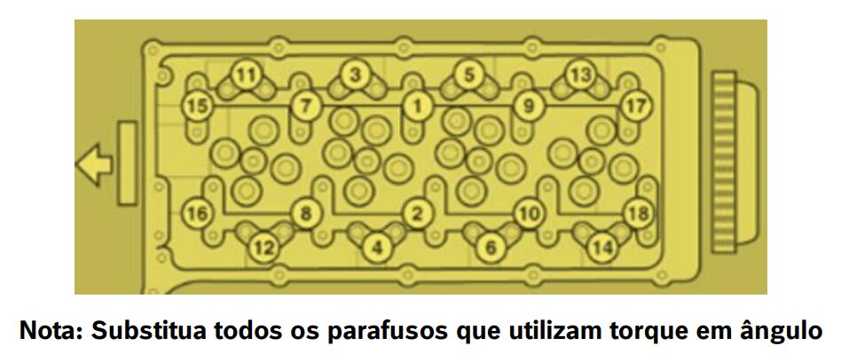 No procedimento de manutenção do cabeçote, é obrigatório substituir todos os parafusos que utilizam torque em ângulo. O aperto deve seguir sequência técnica e divisão em etapas: inicialmente 49 Nm, seguido de 120° e, por fim, mais 90°. O controle dessas fases é essencial para garantir a vedação adequada e evitar empenamento.