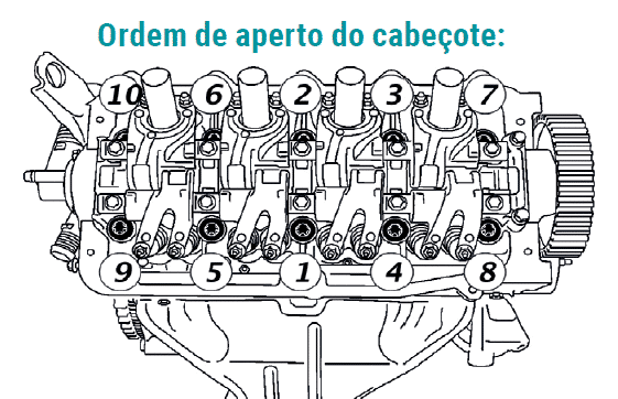 A primeira etapa de 20 Nm deve ser aplicada em todos os parafusos em caracol, de dentro para fora. Já as etapas 2 e 3 seguem a mesma ordem de aperto, porém, devem ser aplicadas no mesmo parafuso em sequência antes de passar ao próximo.