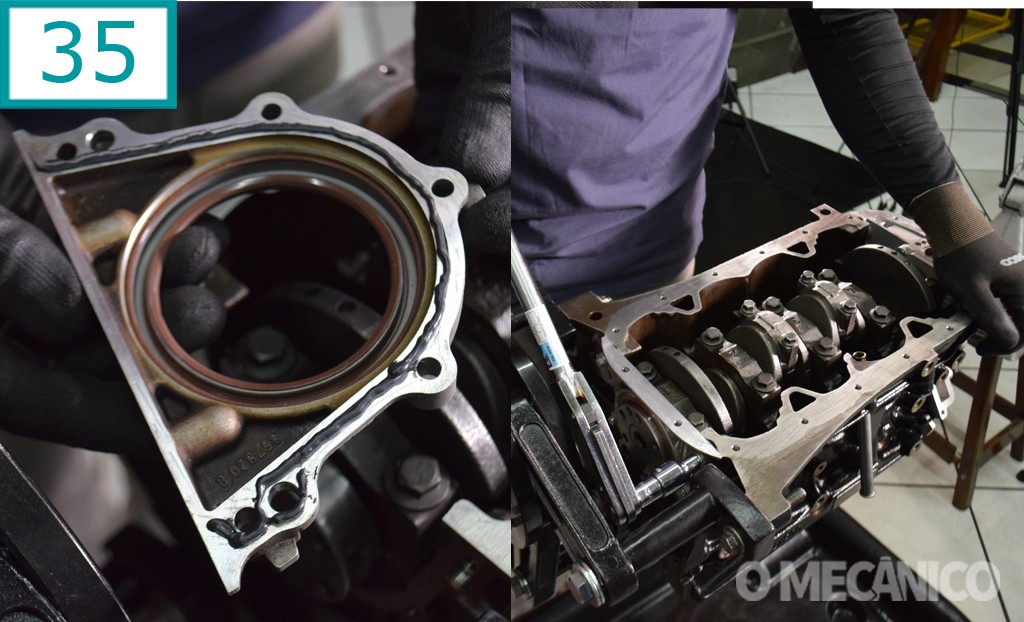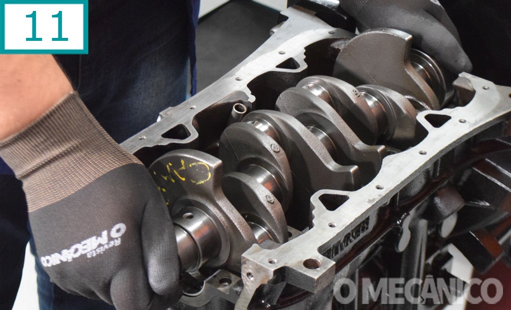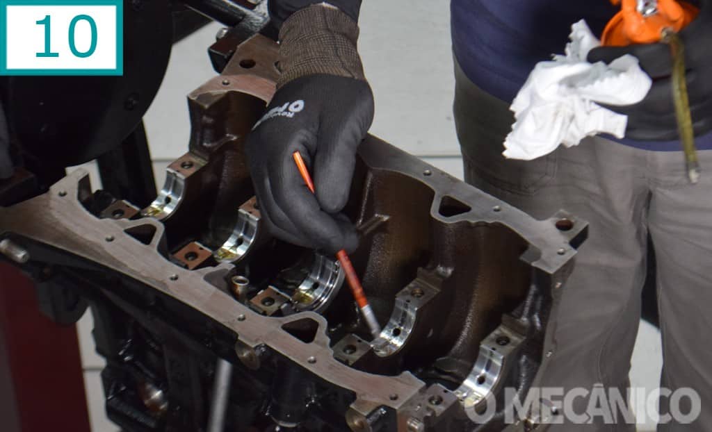 Obs: Certifique-se de que os componentes que vieram da retífica, bloco e virabrequim neste caso, estejam totalmente limpos. Por via das dúvidas, faça uma lavagem adicional nas peças em sua oficina para ter certeza de que nenhum canal (seja de arrefecimento ou lubrificação) esteja obstruído por limalhas de metal