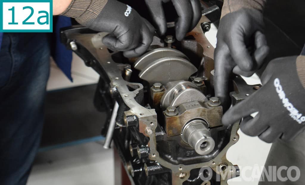 Obs: Faça o teste de folga radial dos munhões com fio plástico indicado para esse fim (conhecido no mercado como plastigage), que corresponde ao filme de óleo que lubrificará os munhões. Para esse teste, os mancais devem ser torqueados como indicado no passo nº13. O resultado mensurado deve estar entre 0,020 e 0,045 mm. Fora dessa faixa, o motor estará sujeito a problemas de lubrificação. O teste deve ser feito a seco.