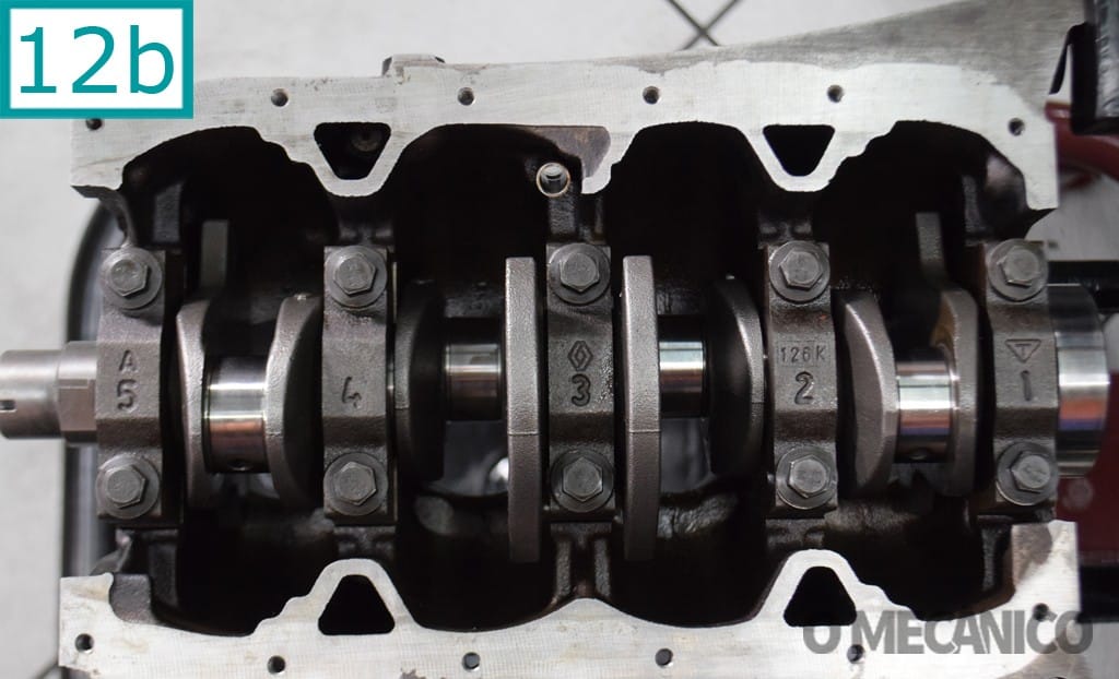 12) Monte os mancais dos munhões (12a). Note que o 1º mancal fica ao lado do volante e o 5º, ao lado do sincronismo (distribuição) (12b). Os números que identificam cada mancal devem apontar para o lado da admissão. Use como referência neste motor o tubo da vareta de óleo. Por segurança, sempre substitua os parafusos de fixação dos munhões.