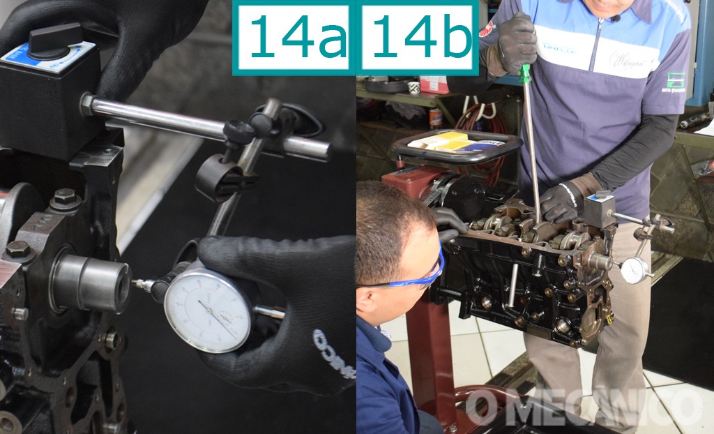 14) Após aplicar o torque corretamente, meça a folga axial do virabrequim com um relógio comparador aferido. Posicione o apalpador do relógio comparador na extremidade no lado da distribuição (14a). Movimente o virabrequim fazendo uma alavanca para um dos lados e zere o relógio. Faça a alavanca na direção oposta para obter a folga total (14b). No caso do motor desta reportagem, a folga medida foi de 0,08 mm.