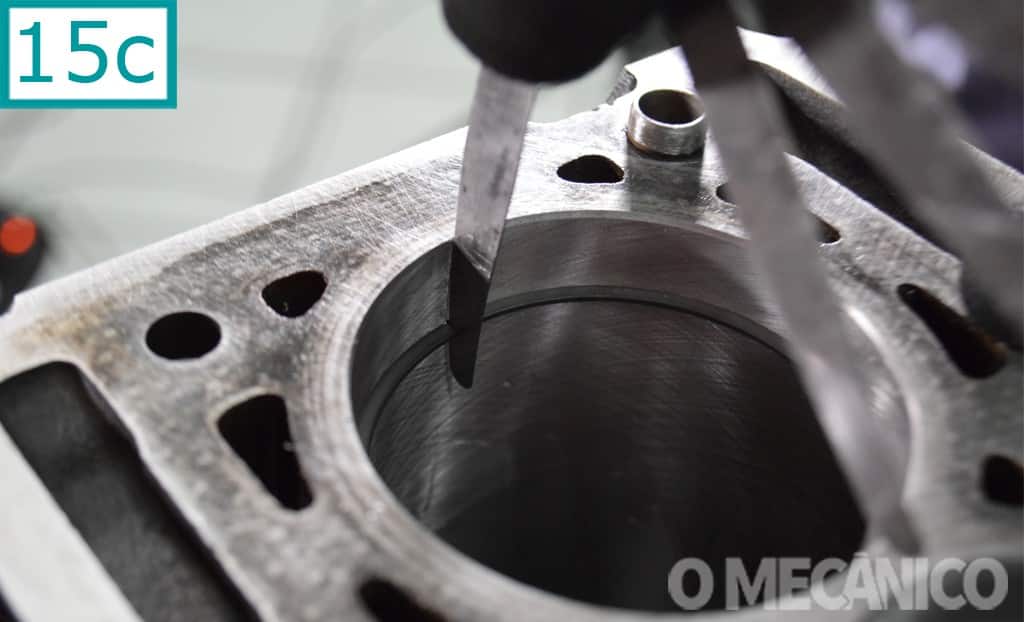 15) Meça a folga das pontas dos anéis inserindo-os nos cilindros (15a). Acomode os anéis no interior do cilindro na posição horizontal com ajuda do próprio pistão (15b). Insira o calibre de lâminas nas pontas e confira os resultados com as medidas corretas segundo a fabricante do motor (15c). Essa operação também atesta o sucesso da usinagem das camisas.