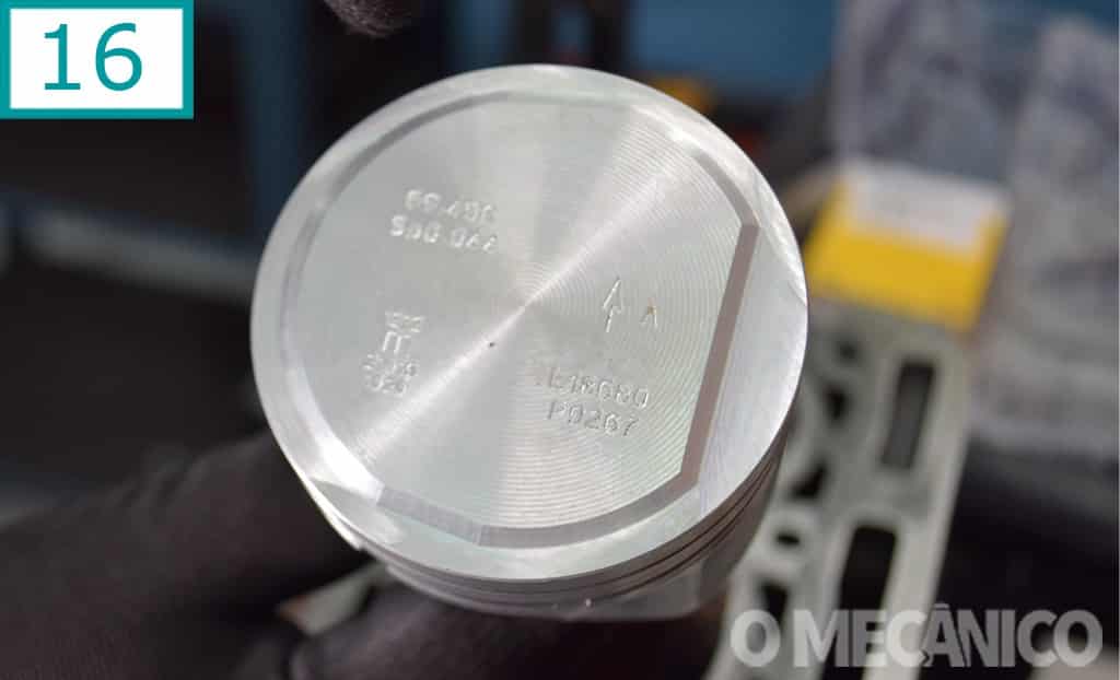 17) No caso dos pistões da Mahle/Metal Leve para este motor, há uma seta indicando o sentido de montagem apontando para o volante (“v”) (17a). Dentre os outros códigos, destaque no canto superior esquerdo para a medida em milímetros de diâmetro nominal (“69,456”) e folga (“Sp 0,044”) (17b). Ao somar o diâmetro do pistão com a folga, obtém-se o diâmetro que o cilindro deve ter após sua retífica.
