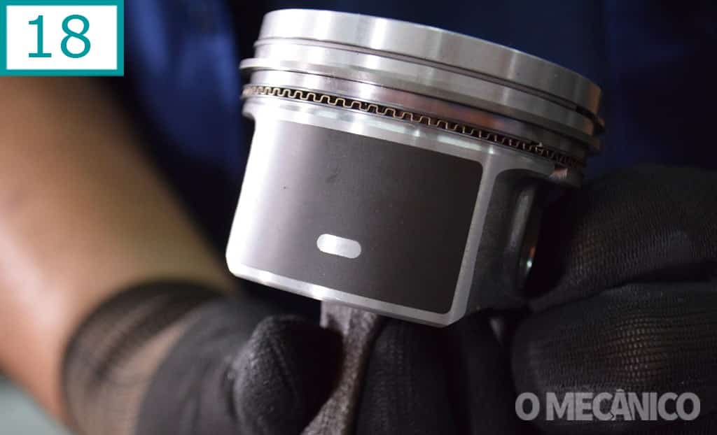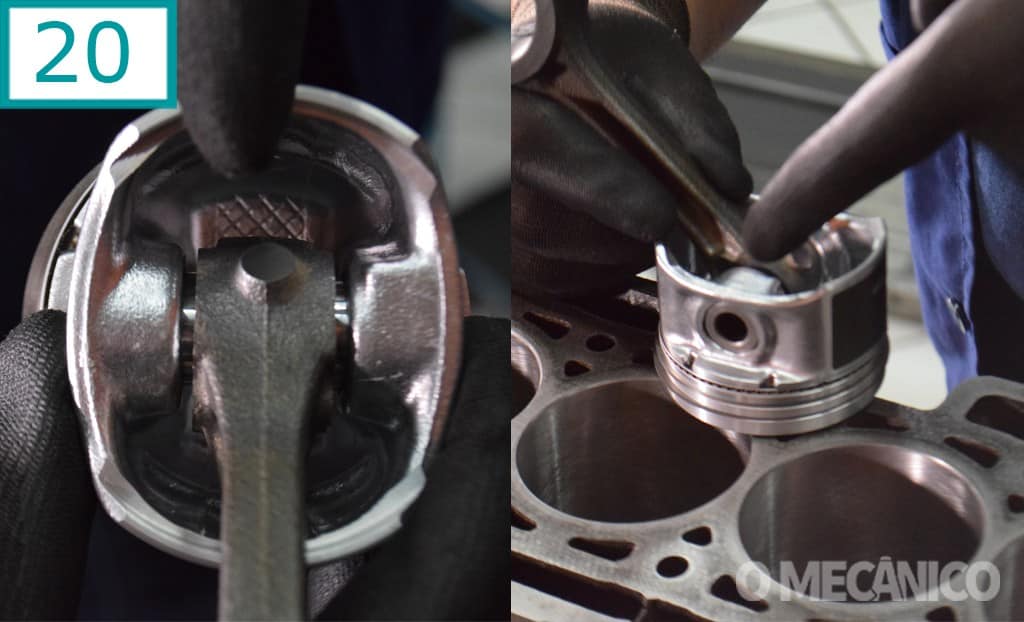 20) Como o pino neste caso é montado por interferência, sem anel trava, o conjunto deve ser montado com gabarito para perfeita centralização, sob aquecimento de aproximadamente 250°C, segundo o manual de reparo da Renault. Caso a biela fique fora de centro, durante o funcionamento do motor, vai haver um ruído característico de “batida de pino”. Ainda, em nenhuma hipótese as peças devem ser aquecidas sem controle de temperatura (como, por exemplo, maçaricos), sob risco de superaquecer as peças, deformar o cubo do pistão e sujeitá-lo a travamento e trincas.