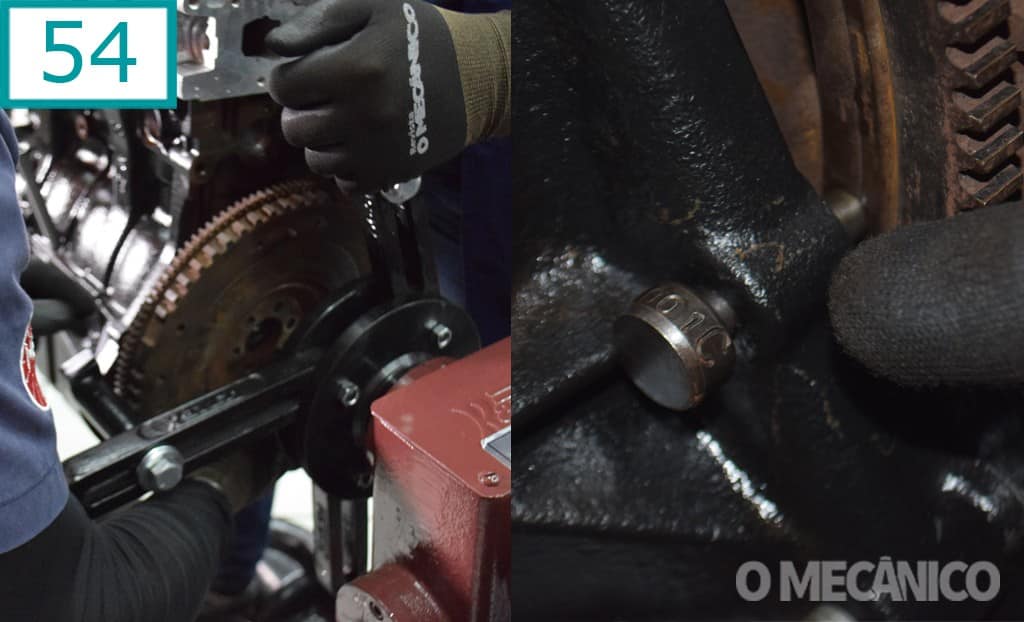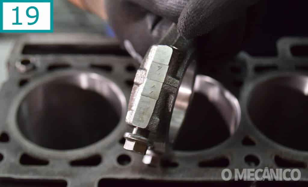 19) No caso do reparo relatado nesta reportagem, os pistões já vieram da retífica montados nas respectivas bielas. Estas possuem também referência de montagem: o lado usinado, com a numeração dos cilindros, deve apontar para o lado da admissão. Assim como feito nos munhões, use como referência neste motor o tubo da vareta de óleo.