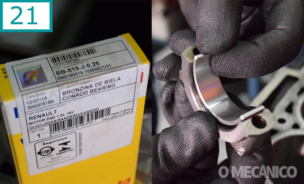 21) Instale as bronzinas de biela. Siga as mesmas orientações das bronzinas de mancal: abra o pacote com estilete e instale as bronzinas centralizadas. Código do conjunto: BB-519-J – 0,25