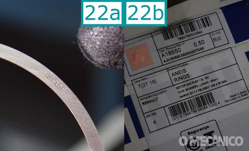 22) Como orientação de montagem no pistão, os anéis desse jogo possuem a gravação “MTOP”, que deve ficar virada sempre para cima (22a). O pacote dos anéis utilizado nesta reportagem tem código Metal Leve A18550 – Medida 0,50 mm (22b).