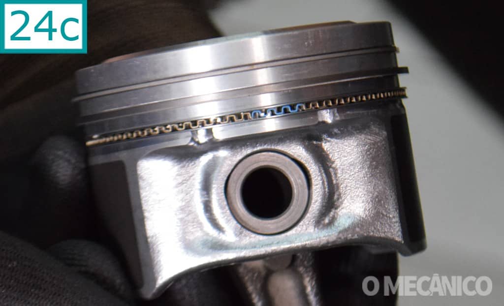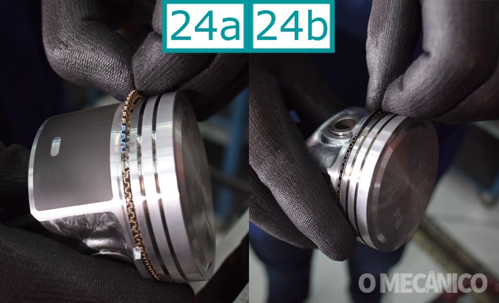 Obs: As pontas da mola expansora não podem estar uma sobre a outra, mas sim paralelas (24c). Se isso ocorrer na montagem, a mola vai quebrar durante o trabalho no cilindro. Além disso, os segmentos – que são responsáveis por manter o filme de óleo do cilindro na espessura correta – vão trabalhar soltos e a película lubrificante não se formará corretamente. As consequências serão consumo de óleo na câmara de combustão, fumaça etc.
