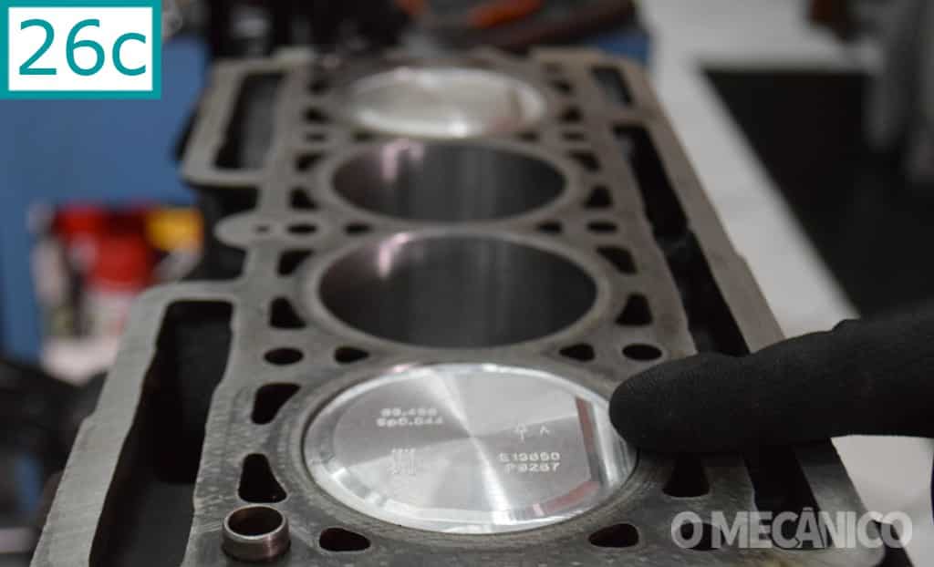 26) Insira os conjuntos de pistões e bielas no bloco. Lubrifique o pistão, só o suficiente para deslizar na cinta de anel (26a). Bata levemente na própria cinta para acomodá-la (26b) e observe o sentido correto de montagem antes de inserir o pistão (26c).