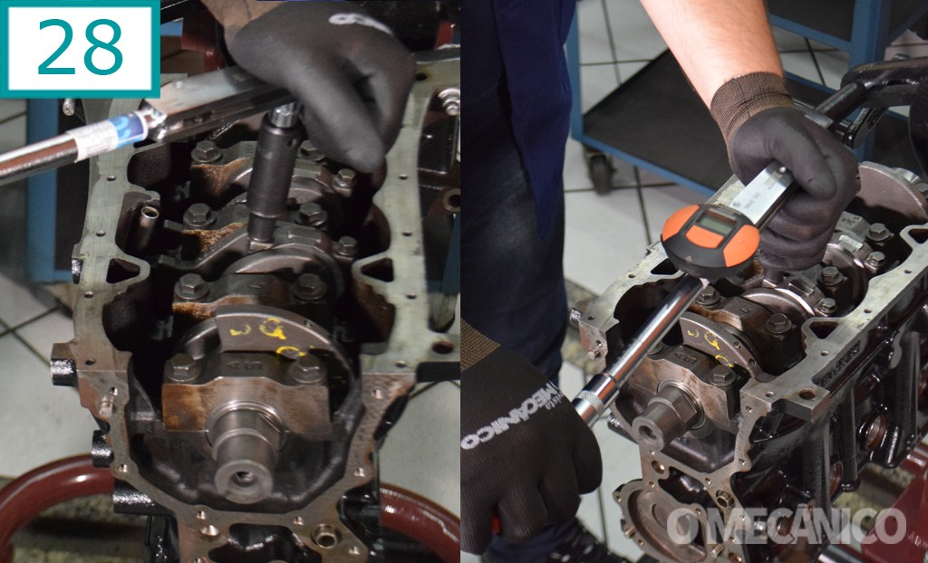 Obs: Jamais aplique torque de aperto fora das especificações indicadas no passo anterior. Torque excessivo vai fechar o alojamento dos munhões, deformar as bronzinas e diminuir a folga radial. Isso prejudica a lubrificação e causa engripamento das bronzinas pelo consequente contato direto entre bronzinas e eixo.