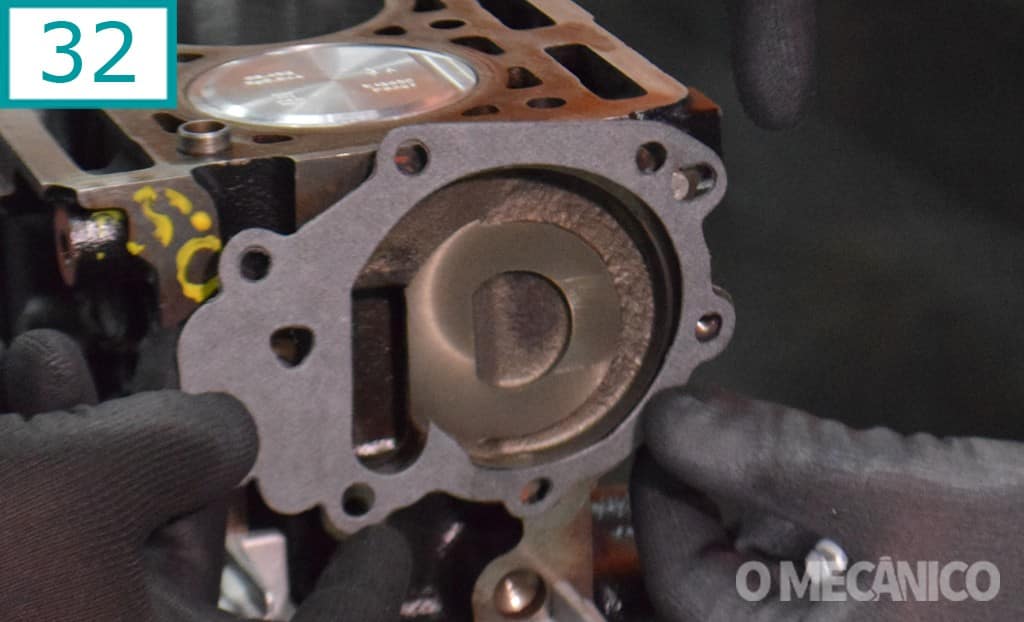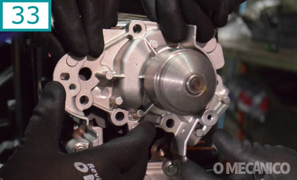 32) Siga para a bomba d’água. Esta não recebe junta líquida, mas sim a junta de vedação nova (guarnição).