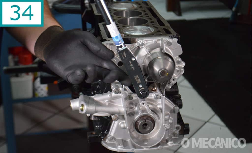 34) A bomba d’água também tem carcaça de alumínio e requer aperto baixo e preciso em seus parafusos. O torque correto também é de 9 Nm.