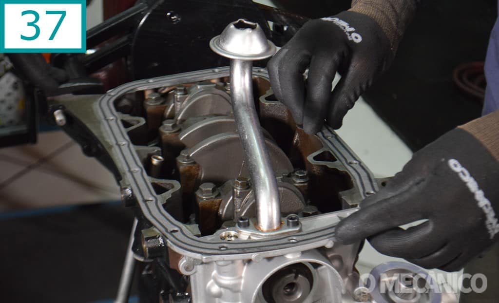 37) Na instalação do cárter, Thiago preferiu não utilizar junta líquida e mostrou como alternativa uma guarnição, que tem assentamento melhor, instalação mais simples e dispensa o uso de qualquer vedação líquida.