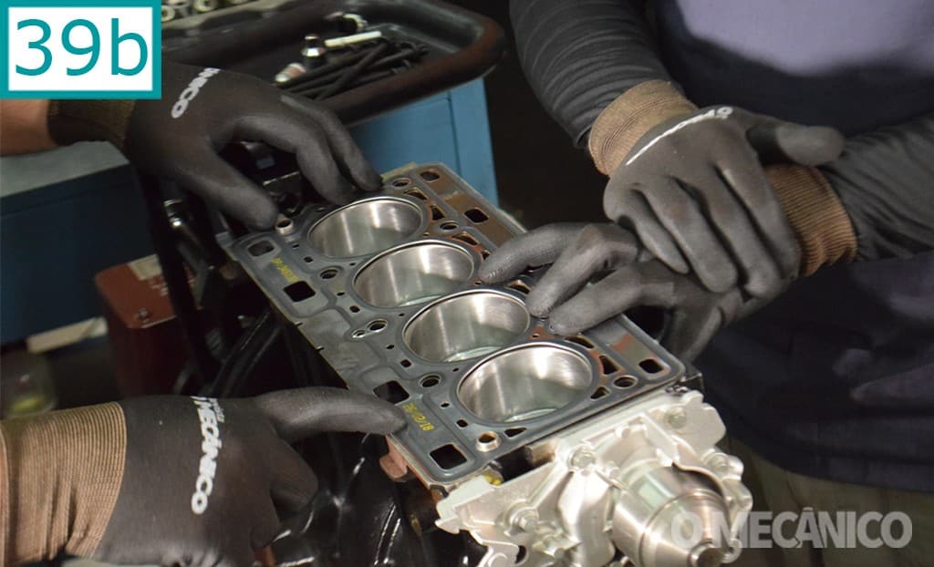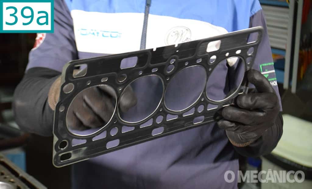 39) Monte a junta do cabeçote. A peça tem a mesma configuração da junta original: metálica, de espessura 0,49 (± 0,04) mm. O lado de montagem é indicado pelo código, que fica voltado para cima. Curiosamente, a furação dos cilindros na junta não é perfeitamente circular (39a) e, posicionada sobre os cilindros, parece irregular (39b). O especialista da Mahle explica que isso na verdade é um reforço da junta e, no momento da instalação do cabeçote, o encosto estará perfeito.