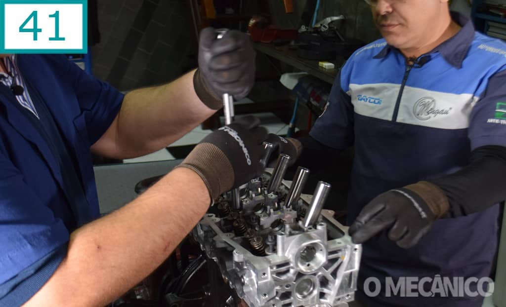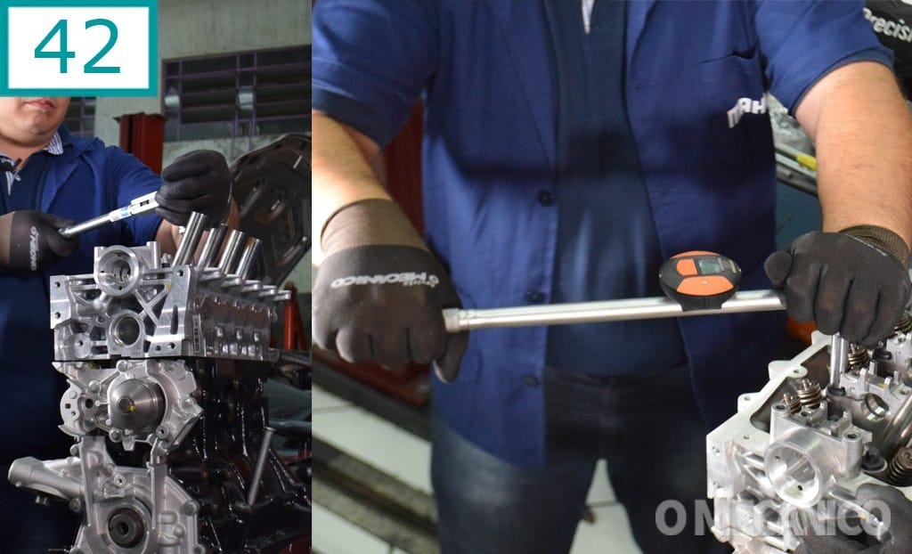 41) Os parafusos de fixação do cabeçote, segundo Thiago, devem ser obrigatoriamente substituídos por novos. O técnico da Mahle relata que esse tipo de parafuso, uma vez torqueado, ultrapassa seu limite elástico e se deforma. Se ele for reutilizado, ao ser novamente torqueado, ele pode estourar ou dar aperto falso.