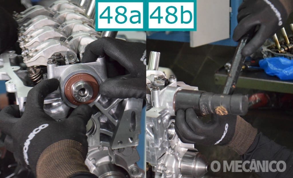 48) Complete a instalação com o retentor do eixo de comando. Encoste o retentor com a mão (48a), depois utilize a ferramenta adequada para faceá-lo corretamente ao cabeçote (48b). Cuidado para não danificar o lábio da peça na instalação: caso ele se corte, vai causar vazamento de óleo na região.