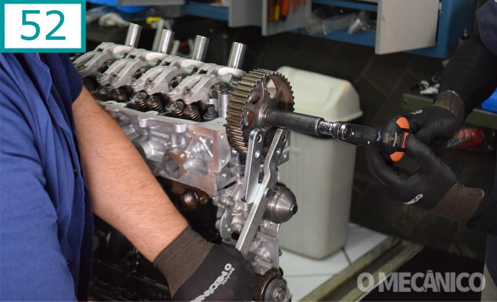 51) A polia do eixo de comando de válvulas também é chavetada. Mingau aponta que foi necessário trocar o parafuso porque o anterior foi apertado com ferramenta pneumática, excedendo em muito o torque de aperto correto.