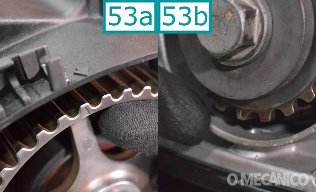 53) Verifique os pontos de fasagem do motor. Na polia de comando, basta encaixar a tampa de válvulas para usar a seta como referência (53a). Na polia dentada do virabrequim, há um ressalto inferior que deve ser tomado como base (53b).