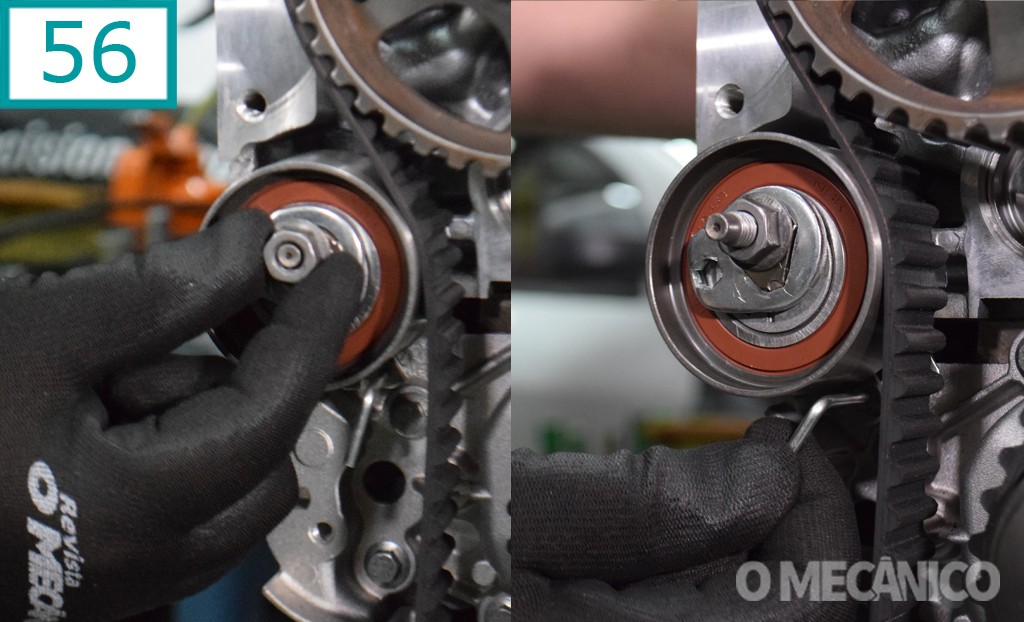 58) Para acomodar a correia, gire o motor seis vezes e, a seguir, coloque o motor novamente no ponto. Feito isso, refaça o tensionamento da correia, como descrito no passo nº 57.