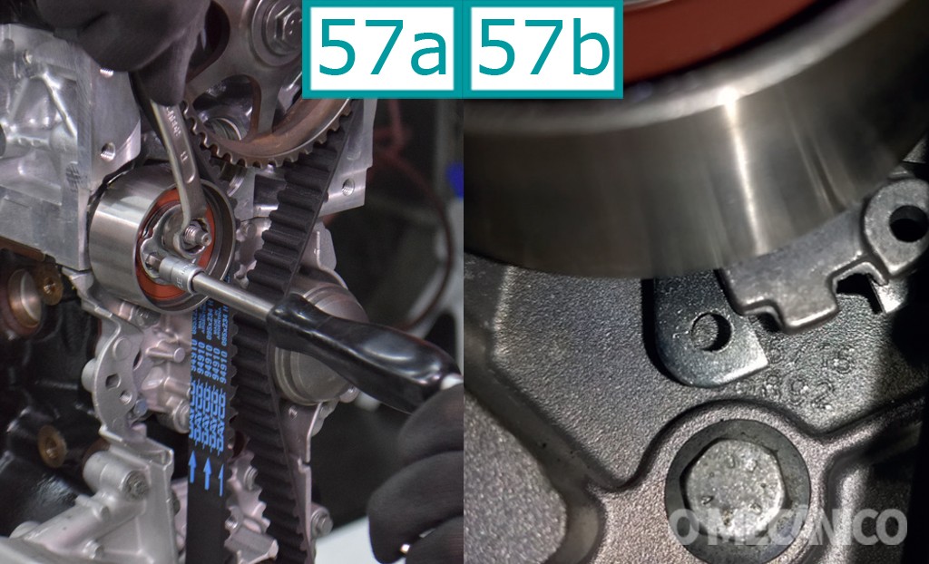 57) Faça o tensionamento no sentido anti-horário (uma seta indica o sentido que deve ser girado) (57a). Há um localizador embaixo do rolamento cuja janela indica até que ponto o tensionador deve ser movimentado (57b). Ao alcançar esse ponto, aperte a porca para segurar o tensionamento.