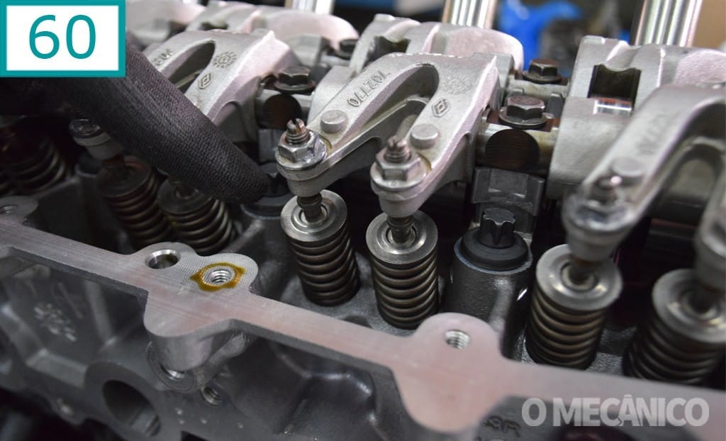 40) Monte o cabeçote. O cabeçote novo cedido pela Renault do Brasil veio da mesma forma de um adquirido em concessionária: com as válvulas montadas e os mancais. É necessário adquirir eixo de comando e balancins separadamente, bem como, os parafusos dos mancais.