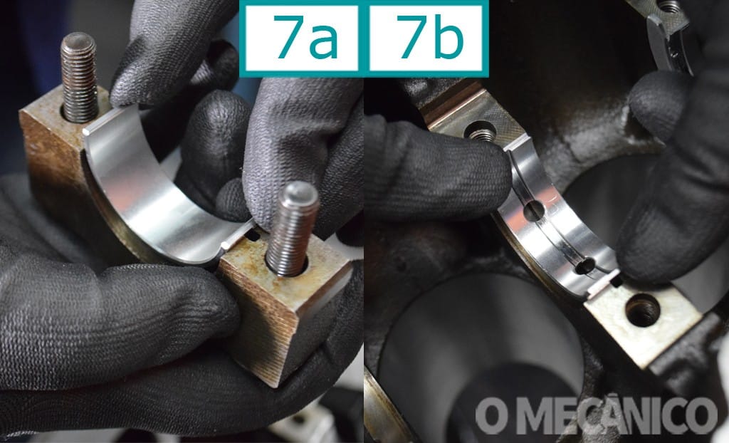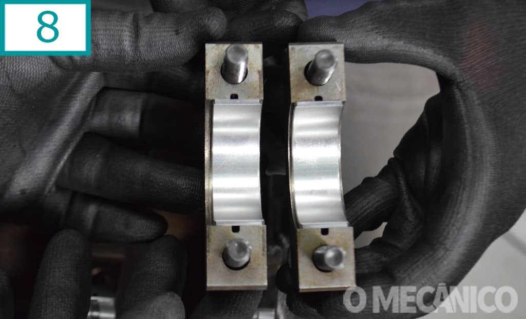 7) No conjunto, há dois tipos de bronzinas: as lisas (capas dos munhões) (7a) e as perfuradas com canal (alojamentos dos munhões no bloco) (7b). Repare que elas não possuem a chamada “unha”. Ao contrário do que muitos acreditam, a “unha” não tem função estrutural. “Quem segura a bronzina no lugar é o torque de aperto correto dado no mancal”, explica o especialista da Mahle. Esse ressalto apenas orienta quanto ao lado de montagem para coincidir com os canais de lubrificação. Como as bronzinas de reposição neste motor possuem furos dos dois lados e pode ser montada em qualquer sentido, não há necessidade da “unha”.