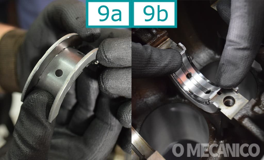 9) Uma das bronzinas dos alojamentos dos munhões é flangeada (9a) e deve ser montada no munhão central (9b). Esta bronzina pode ser encaixada em qualquer sentido, já que a furação de lubrificação coincide. Os flanges são responsáveis por ajustar a folga axial do virabrequim. Por serem móveis, elas se ajustam melhor no alojamento que as fixas.