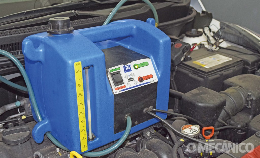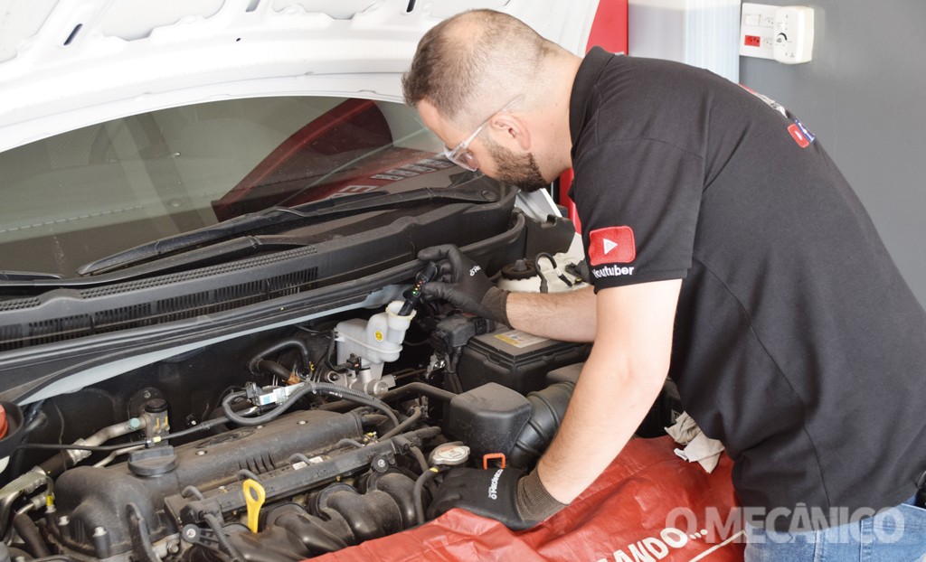 1) Verifique o nível de fluido de freio no reservatório do veículo e teste sua qualidade com aparelho apropriado. No momento em que Ricardo colocou o aparelho no fluido do HB20 da reportagem, o indicador vermelho piscou imediatamente, acusando que havia mais de 5% de água e indicava a necessidade de trocar o fluido.