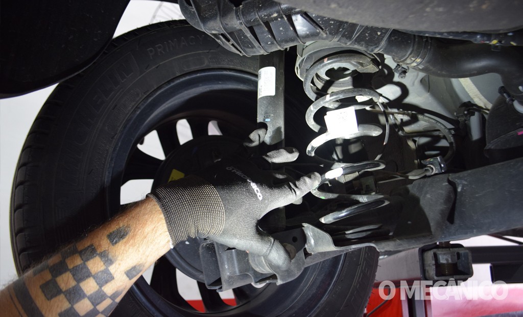 Ao levantar o HB20 no elevador, Junior comenta sobre a espessura dos elos das molas, que são mais finos do que o comum, e a manga de eixo, que é pequena. A substituição dos amortecedores, tanto os dianteiros quanto traseiros, está bem fácil e não necessita ferramentas especiais. Ao lado do amortecedor traseiro está o tubo de plástico de abastecimento do combustível. Junior acha que a tubulação ficou muito exposta: “se algo bater na peça, ela quebra, como, por exemplo, a borracha do pneu caso ele estoure”.