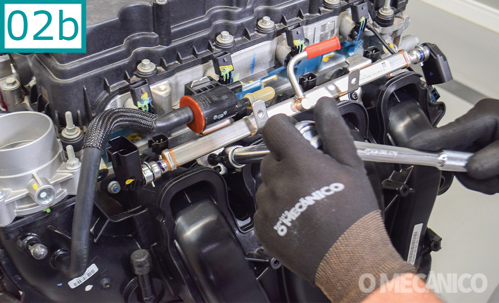 2) A flauta de combustível é feita em aço inoxidável e aquecida (2a), para a função de preaquecimento do etanol em partidas a frio. Para removê-la, utilize a chave hexalobular 30. Na montagem, o torque de aperto é de 6 Nm (2b). “O torque é baixo pois os parafusos são de rosca soberba, aplicados diretamente no plástico do coletor”, afirma o especialista de Produto Powertrain da Stellantis, Erlon Rodrigues.