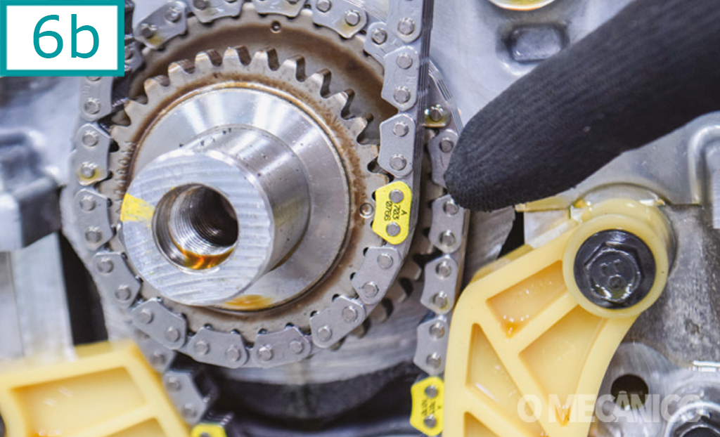 6) Os pontos de fasagem das polias devem coincidir com elos coloridos da corrente, na cor laranja no eixo de comando (6a) e na cor amarela do eixo do virabrequim (6b).