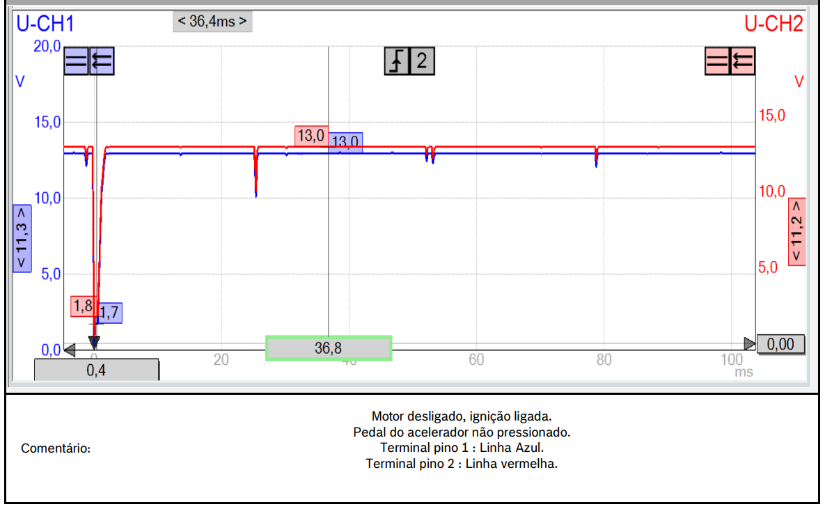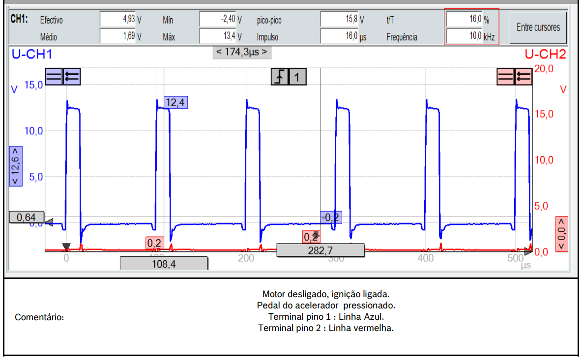Por fim, com o motor ligado e nas condições de marcha-lenta e aceleração, verifique os valores de tensão e o formato de ondo obtidos no corpo de borboleta, para diagnosticar possíveis falhas.