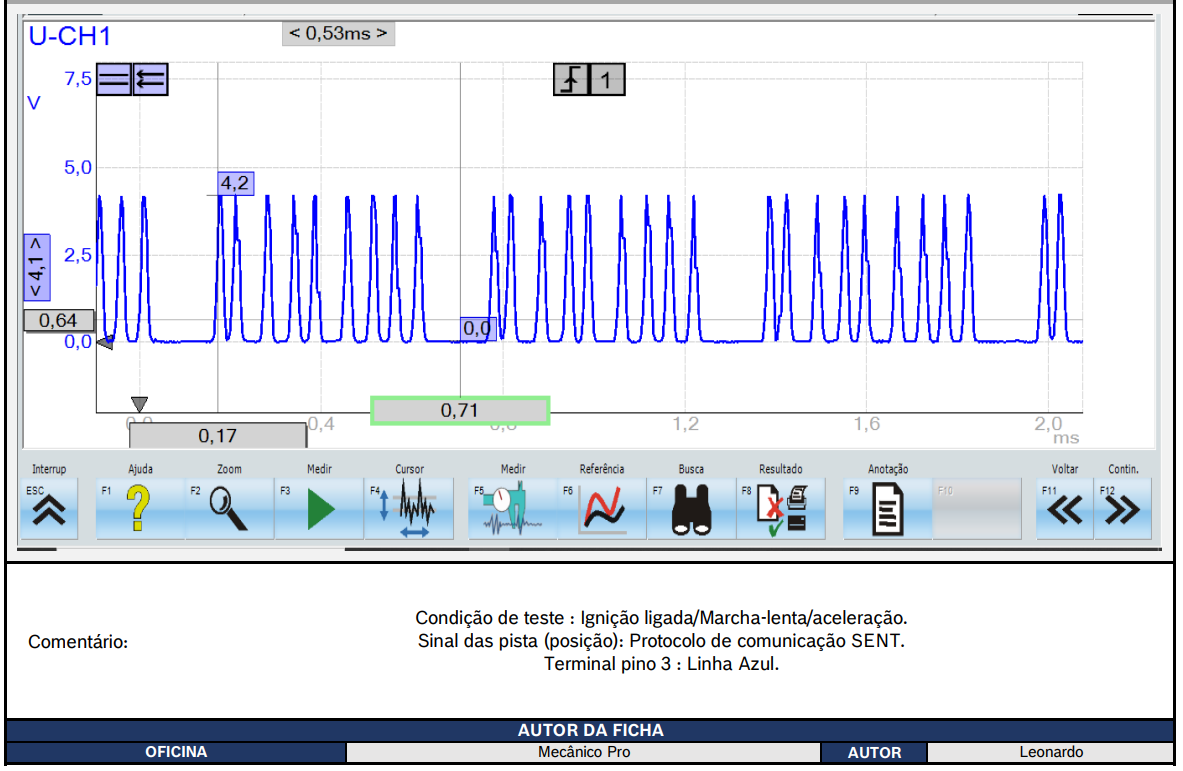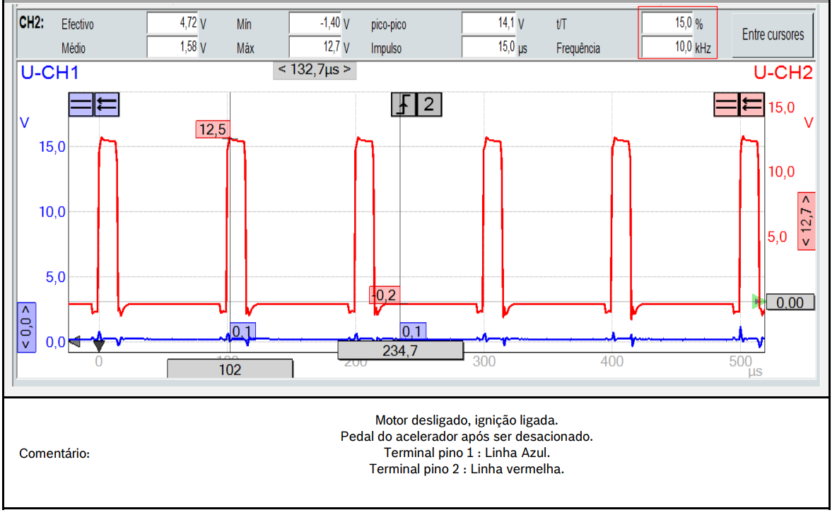 Depois, a recomendação é comparar o sinal do pino 5 da bomba de baixa pressão com os valores de referência, que é o sinal de comunicação entre a ECU do motor e a bomba de combustível. Os valores de comparação também foram obtidos com o motor aquecido, abastecido com gasolina e em marcha lenta.