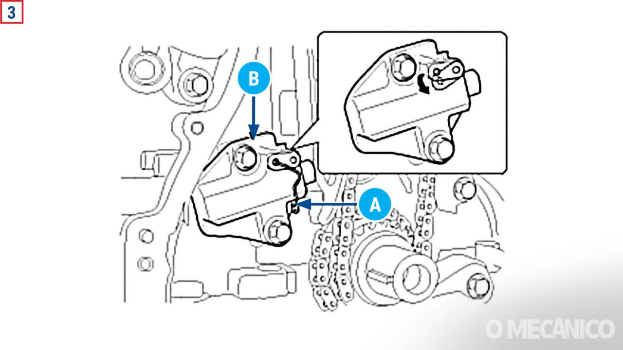E) Com uma haste fina, pressione a catraca do tensionador para baixo e comprima o pistão do tensionador e insira um pino de bloqueio (A) no orifício para manter o pistão recuado. Em seguida, remova o tensor da corrente de distribuição (B). (3)