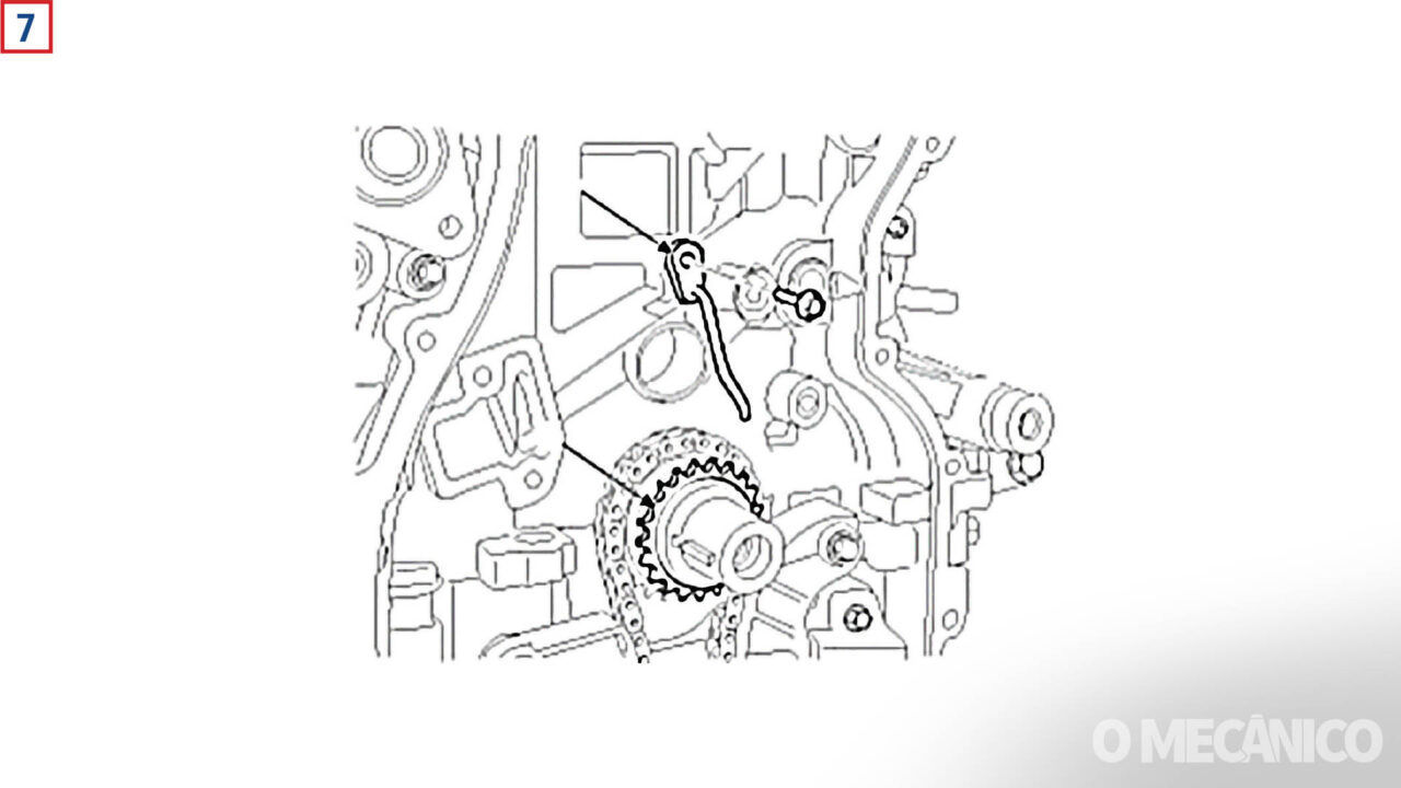 I) Remova a engrenagem da corrente do virabrequim e o jet oil da corrente (7).