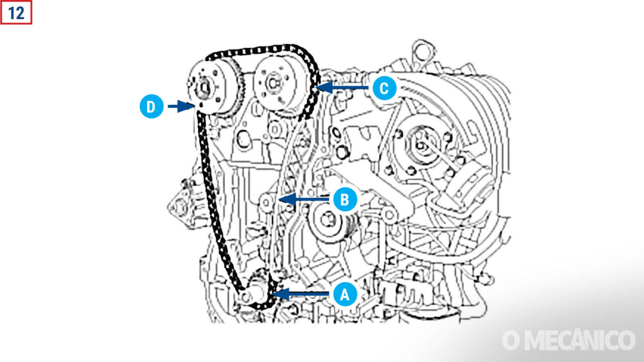 F) Monte a nova corrente de sincronismo, seguindo a sequência (12): Virabrequim (A) → Guia da corrente (B) → Polia CVVT de admissão (C) → Polia CVVT de escape (D).