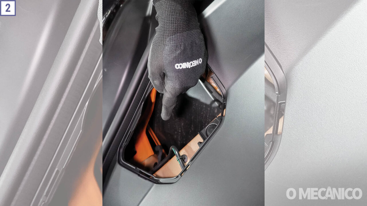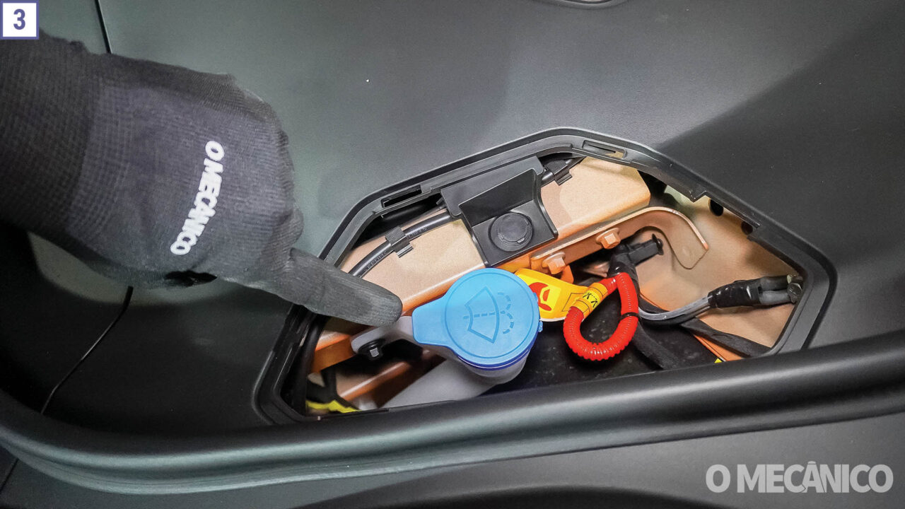 A terceira e última janela de acesso, permite que o mecânico tenha contato com os polos positivo e negativo da bateria de 12V, a caixa de fusíveis que está acima da bateria e ao reservatório do fluido de freio. Há possibilidade de enxergar o inversor elétrico e o reservatório do fluido de arrefecimento (4), mas sem acesso ao mecânico.
