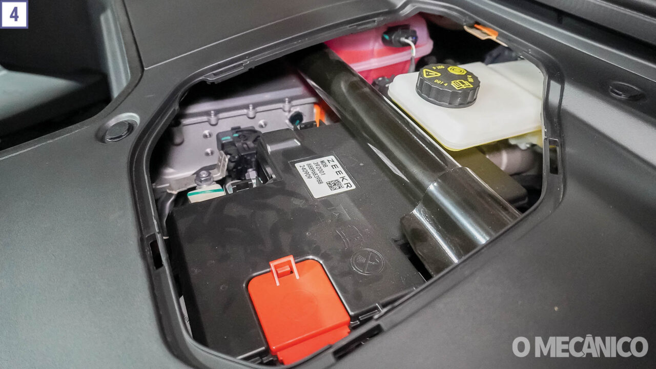 Ao abrir o capô do Zeekr 001, o mecânico irá se deparar com uma tampa plástica que cobre todos os componentes (1) como reservatório do líquido de arrefecimento, inversor elétrico, motor elétrico, entre outros. A Zeekr optou por não deixar os sistemas a mostra e, com isso, na parte dianteira há possibilidade de utilização como um pequeno bagageiro.